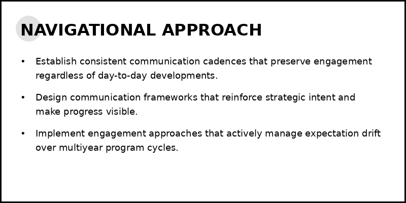 Effective programs address this risk through deliberate engagement approaches that reinforce context and confirm strategic alignment over time. This approach acknowledges the natural asymmetry between program teams who operate deeply within the details and stakeholders who engage intermittently across many priorities.